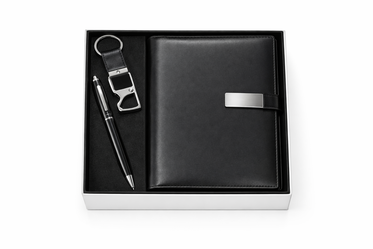 Ye set un logo ke liye design kiya gaya hai jo sophistication aur power ko darshana chahte hain. Iska sleek matte black leather finish aur silver metal accents ise ek ultra-premium look dete hain. Chahe boardroom meeting ho ya kisi special employee ka welcome, ye gift set hamesha ek impact chhoddta hai.